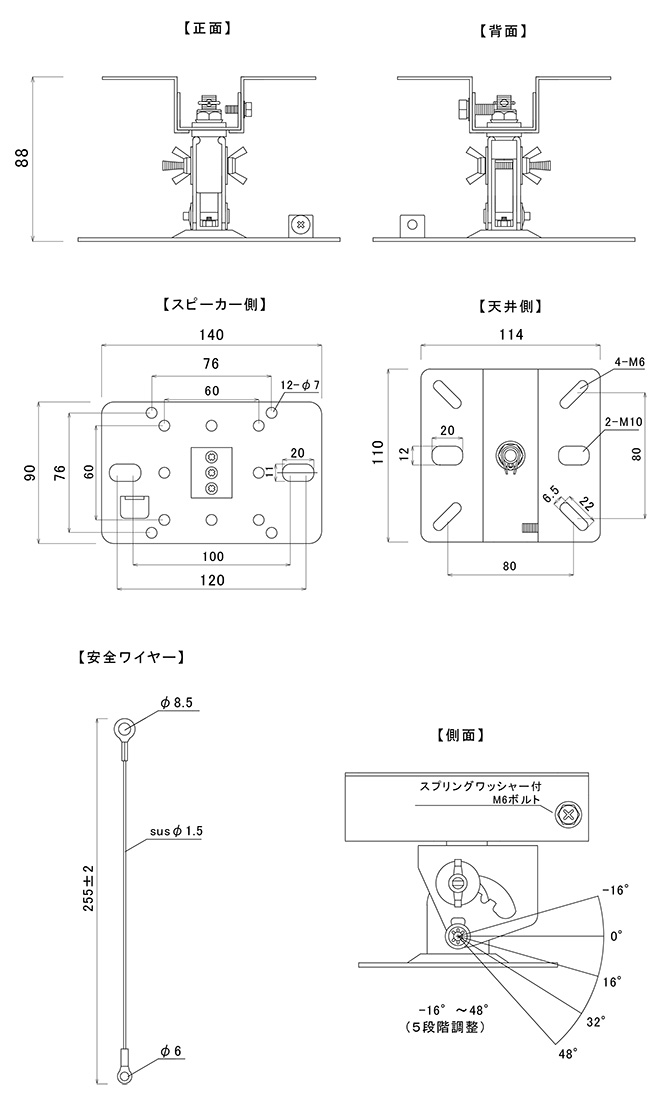 | 角度調整範囲 | 16°、5段階ピッチ: -16°~48° |